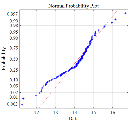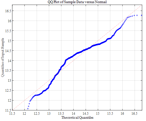 第二个为normplot,其中横轴为变量区间,纵轴为累计概率分布(CDF),红色点划线为根据分析数据均值和方差构建的正式正态分布线,蓝色点为分析样本点,越接近于直线说明样本正态特性越好,由图可知,分析数据尾部远离直线,且中间大量样本分布处(14.5)样本低于直线,因此该分析数据正态性差,或者不服从正态分布。
