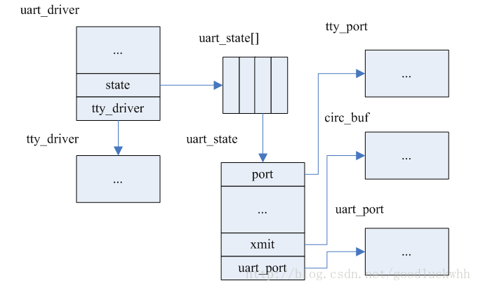 从上图可以看出,一个uart_driver就对应一个tty_driver,而一个uart_driver可以包括多个uart_state,每个uart_state对应一个uart_device,每个uart_device都有自己的tty_port、uart_port以及收发缓存。