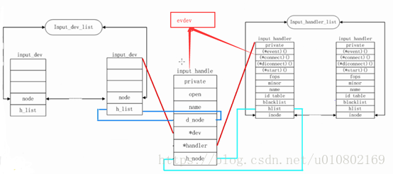 1.vdev.c中evdev_connect()是属于input handler层,是device和handler注册的核心层,且匹配成功后会调用evdev_connect()。一般在内核启动的时候,input handler是已经注册了的,也就是说我们evdev_handler是先有的。然后我们在device层写的input_dev注册进来后遍历input_handler_list,查找有没有一个合适的处理这,当然我们input_dev和input_handler是一个多对一的关系,也就是说我们input_handler是可以处理所有的input_dev的。这就是说我们注册了input_dev后一定能找到一个handler,找到后,就会调用connect方法,其中connect方法会帮你分配一个evdev对象,这个对象里面就有一个成员叫:input_Handle(注意不是handler),它的作用是记录input_dev和input_handler之间的关系的,有两个指针来记录,分别是:*dev和*handler,一旦调用connect,就会把input_dev和input_handler作为参数传入到connect中来,传进来后,*dev指针就指向input_dev,*handler指针就指向input_handler,记录后的作用是:通过input_handle找到input_dev和input_handler;实际上在input_dev中也会记录input_handle中的成员d_node,input_handler中会记录h_node,这样三者(input_handle,input_dev,input_handler)就能互相联系,互相关联了。这样任意一个调用者,可以通过三着中的任意一个查找到另外两个,例如:调用者从input_dev中如何知道d_node属于哪个handle,由于input_handle中的成员d_node是注册到了h_list中的,input_dev通过内核链表技术,container_of技术就可找到,这样找到input_handle后由于其中的*handler是指向input_handler的,这样就能找到处理者了,然后将数据交予处理。三者关系如下