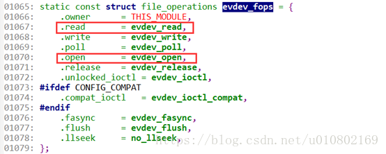 5. 所有的设备节点调用open,read,write文件io的时候实际是调用cdev中fops中各个接口,最终都调用了evdev_fops
