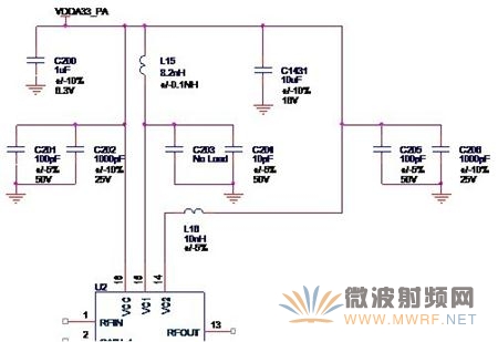 这时,我们就可以把功放芯片的输出端与低通滤波器相连接,就得到了一般射频功率放大电路的完整的输出回路,如图3-8所示。