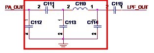 滤波器的设计需要很复杂的计算,在这里我不想探讨过多的理论知识,所以,我就不给出如何计算的方法,只给出一般的低通滤波器的形式。这里需要指出的是,Atheros的设计一般会使用三个元件,而Ralink一般会使用五个元件。如图3-7所示,是Ralink常用的滤波器形式。在图中,C112,C111,C113,C110和C114就组成了一个低通滤波器,来自功放芯片的信号PA_OUT经过滤波器后得到LPF_OUT这信号送至后续电路。