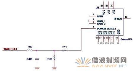 我们在图3-2中已经看到,一般的功放芯片会有POWER_DETECT这样的一个管脚,这个管脚的作用就是用于功率检测的。使用芯片内建的功率检测功能可以简化电路设计,常见的完整形式如图3-9所示。