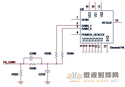 增益控制的作用就是可以改变功放电路的增益,从而能改变输出功率。改变功率放大器最终输出功率的方法有两种,一种是无线收发器改变自身的输出功率,另外一种就是改变功放电路的增益,在这里我们主要关注后者。通常功放芯片的增益控制管脚会有两个或者两个以上,分别改变的是第一级放大和第二级放大的增益值,图3-11是典型的增益控制原理图。来自收发器的控制信号PA_GAIN经过R245和C248组成的RC滤波电路(滤除来自收发器的可能的交流成分)通过两个电阻作用于功放芯片的GAIN_1和GAIN_2两个管脚,从而控制功率放大电路的增益,也控制着最终的输出功率。