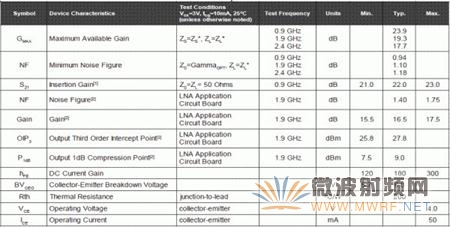 微波器件(晶体管或芯片)的参数,基本上就决定了低噪声放大器的性能,我们来看一下最常用的SGA-8343的参数,如图4-2所示。图中给出的参数包括最大增益,噪声系数,S21,工作频率,供电电压,消耗的电流等等。对于专用的低噪声放大器芯片,参数也基本如此,在这里我们就不详细说了。