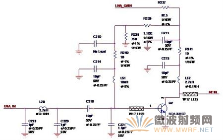 图中的LNA_GAIN是来自无线收发器(Radio Transceiver)的增益控制信号,放大器使用的晶体管就是最常用的SGA-8343,R238,R239,R240是基极的偏置电阻,C219,L20,C220组成了低通滤波器,来自切换芯片(Switch)的LNA_IN通过低通滤波器之后经由C218耦合至低噪声放大器,Q2与C221,L51,C214,R240,C210,R239,R238,C211,R241,C215,L52组成了共射极放大电路,最终输出RFIN送至收发器进行处理。