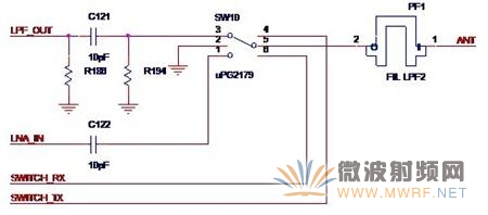 如图5-3所示,就是Atheros的典型发射与接收回路SW10就是那颗切换芯片。LPF_OUT是来自功率放大器的输出信号,R186,C121与R194组成了Π型匹配网络,LNA_IN是送至低噪声放大器的信号,SWITCH_TX与SWICTH_RX这两个信号的组合就控制着是打开发射通路还是打开接收通路。