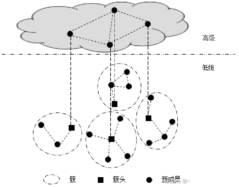 □ 网络被划分为簇,每个簇由一个簇头和多个簇成员组成。