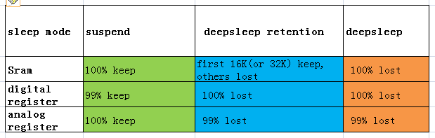 上面的 deepsleep mode,电流很低,但是无法存储 Sram 信息;suspend mode Sram 和 register 可以保持不丢,但是电流偏高。为了实现一些需要sleep时电流很低又要能够确保sleep唤醒后能立刻恢复状态的应用场景(比如 BLE 长睡眠维持连接),8x5x 增加了一种 sleep mode 3:deepsleep with Sram retention mode,简称 deepsleep retention(或 deep retention)。根据 Sram retention area 的大小不同,又分为 deepsleep retention 16K Sram 和 deepsleep retention 32K Sram。Deepsleepretention mode 也是一种 deepsleep,MCU 绝大部分的硬件模块都断电,PM 硬件模块维持工作。功耗是deepsleep mode 础上增加 retention Sram 消耗的电,电流在 2~3uA 之间。deepsleep mode wake_up 时,MCU 将重新启动,程序会重新开始进行初始化。Telink 上一代 826x 系列 IC,使用 suspend(电流在 10uA 以内)来实现 BLE长睡眠维持连接。而 8x5x 由于 suspend 电流偏大,需要使用 deepsleep retention mode 来代替实现。deepsleep retention mode 和 deepsleep mode 在 register 状态保存方面表现一致,几乎全部掉电。deepsleep retention mode 跟 deepsleep mode 相比,Sram的前 16K(或前 32K)可以保持不掉电,剩余的 Sram 全部掉电。