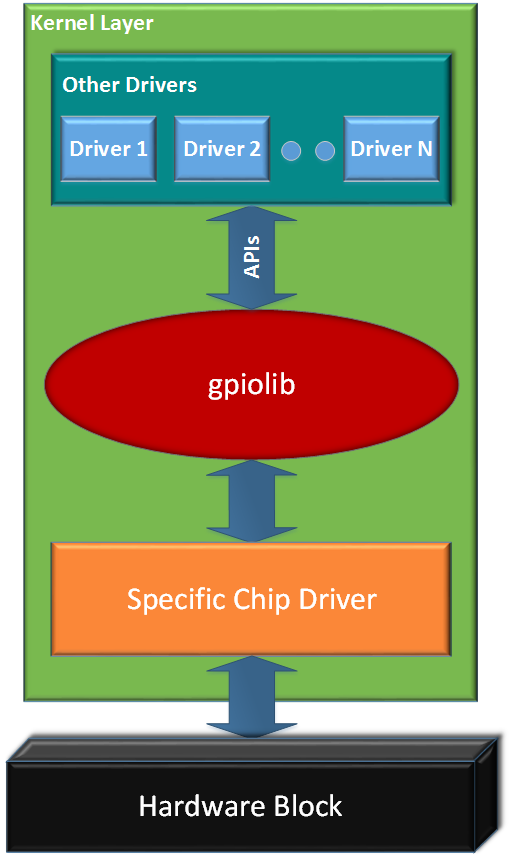 中间层是 Gpiolib,用于管理系统中的 GPIO。Gpiolib 汇总了 GPIO 的通用操作,根据 GPIO 的特性,Gpiolib 对上(其他 Drivers)提供的一套统一通用的操作 GPIO 的软件接口,屏蔽了不同芯片的具体实现。对下,Gpiolib 提供了针对不同芯片操作的一套 framework,针对不同芯片,只需要实现 Specific Chip Driver ,然后使用 Gpiolib 提供的注册函数,将其挂接到 Gpiolib 上,这样就完成了这一套东西。