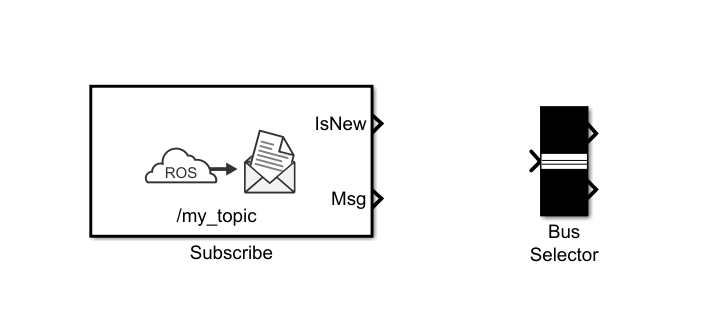 Subscribe模块的输出IsNew是一个布尔值,表示在上一个时间步骤中是否收到了消息。当IsNew为真时,Msg持有新收到的消息。当IsNew为假时,Msg持有最后收到的消息。如果我们对该输出此并不关心,可以连一个terminator模块,terminator的作用是终止未连接的输出端口。使用Terminator模块去盖住不与其他模块连接的模块的输出。如果我们需要对其进行观测,则可以连一个Scope模块,如下图所示: