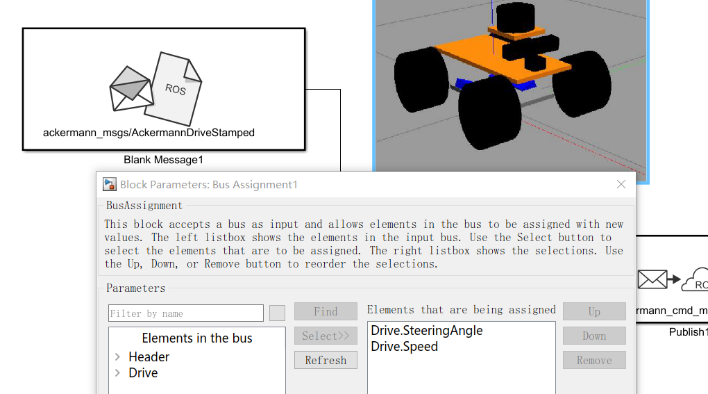 比如我选择指定了名为ackermann_msgs/AckermannDriveStamped消息,并通过Bus Assignment模块对我们想要指定的值SteeringAngle和Speed进行赋值