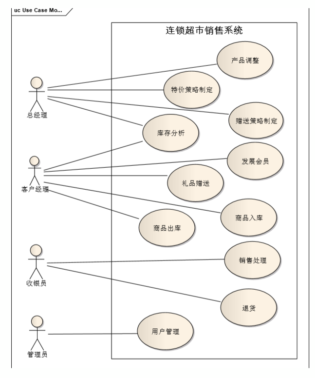 - ⽐如连锁超市系统中销售用例就是⼀个关键的用例。它所覆盖的面广,如果销售用例可以实现的话,其它⽤例的实现就⽐较有信⼼了。⽽且这个需求需要做到端到端的实现。