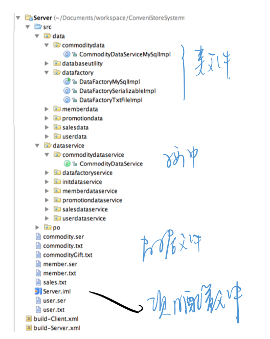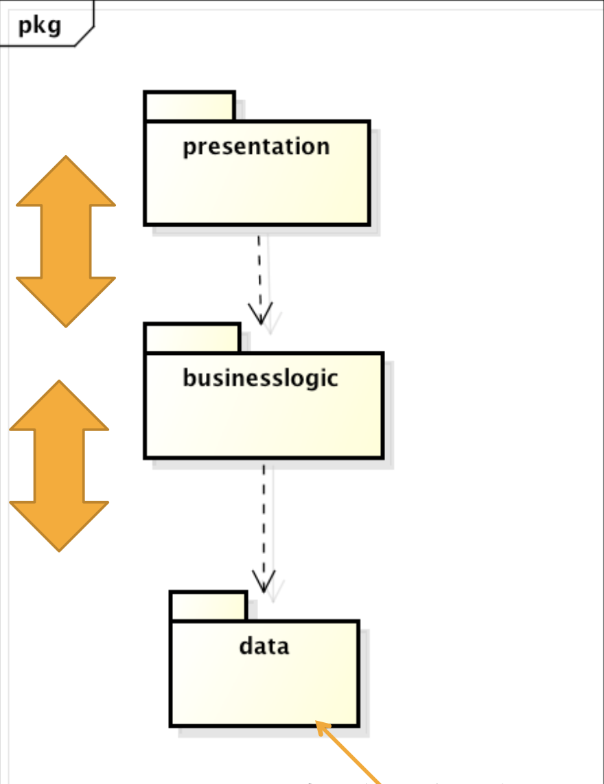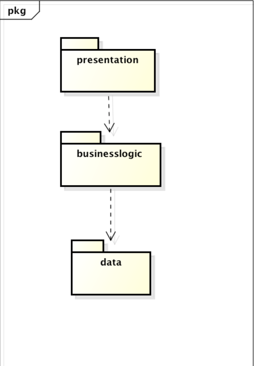 每一个展示层包只和一个业务逻辑包相连;每一个业务逻辑包只与他对应的数据包进行交互;数据分不同包——实现层间包交互是一对一的
