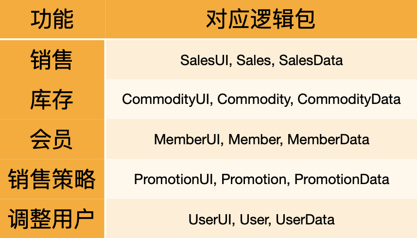 基本功能:销售、库存、会员、销售策略、用户 - 确定功能对应的逻辑包