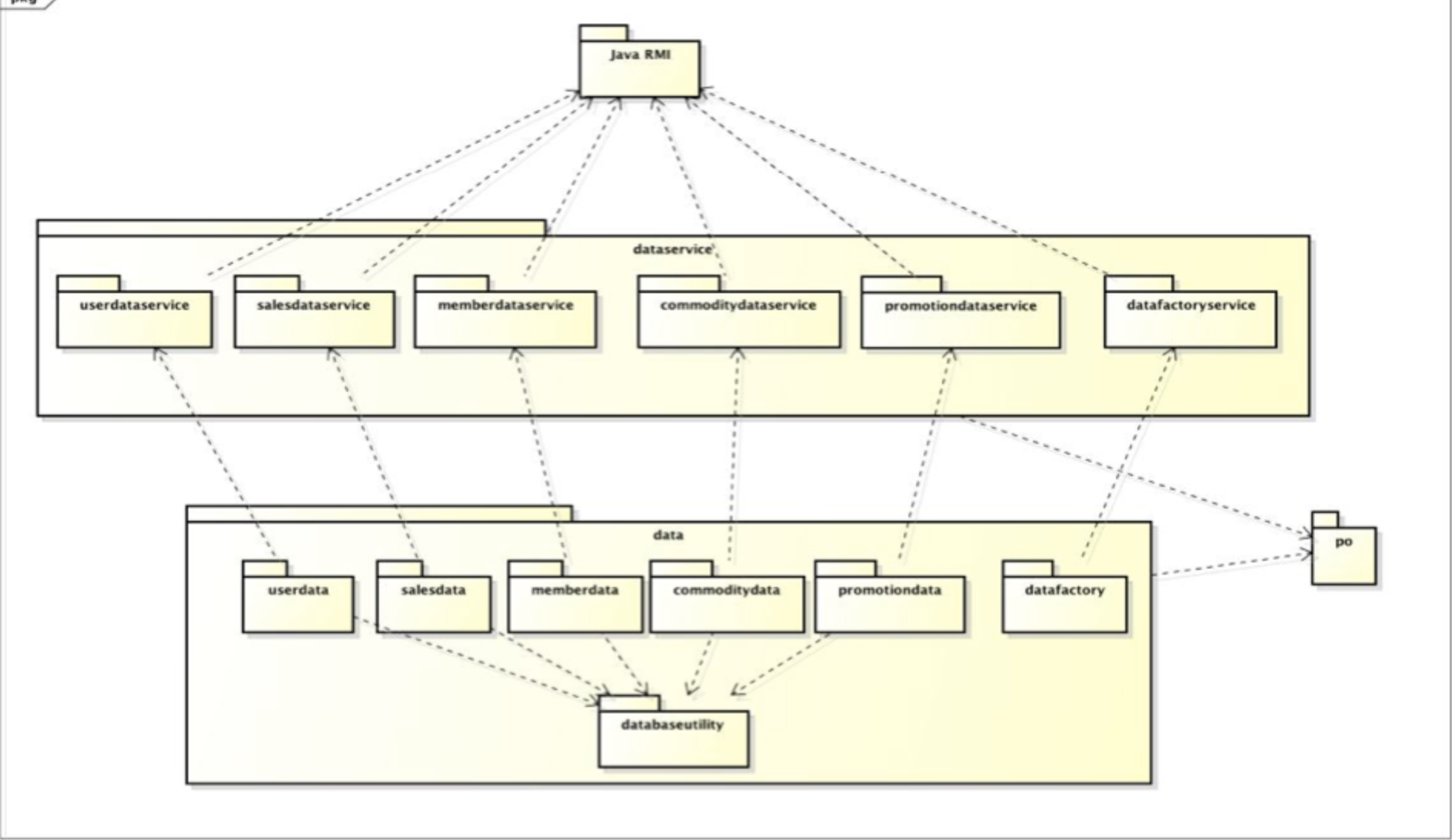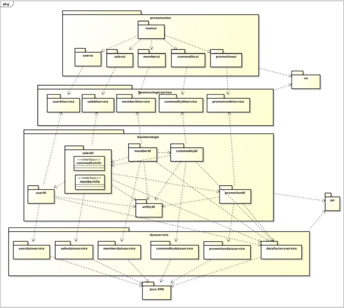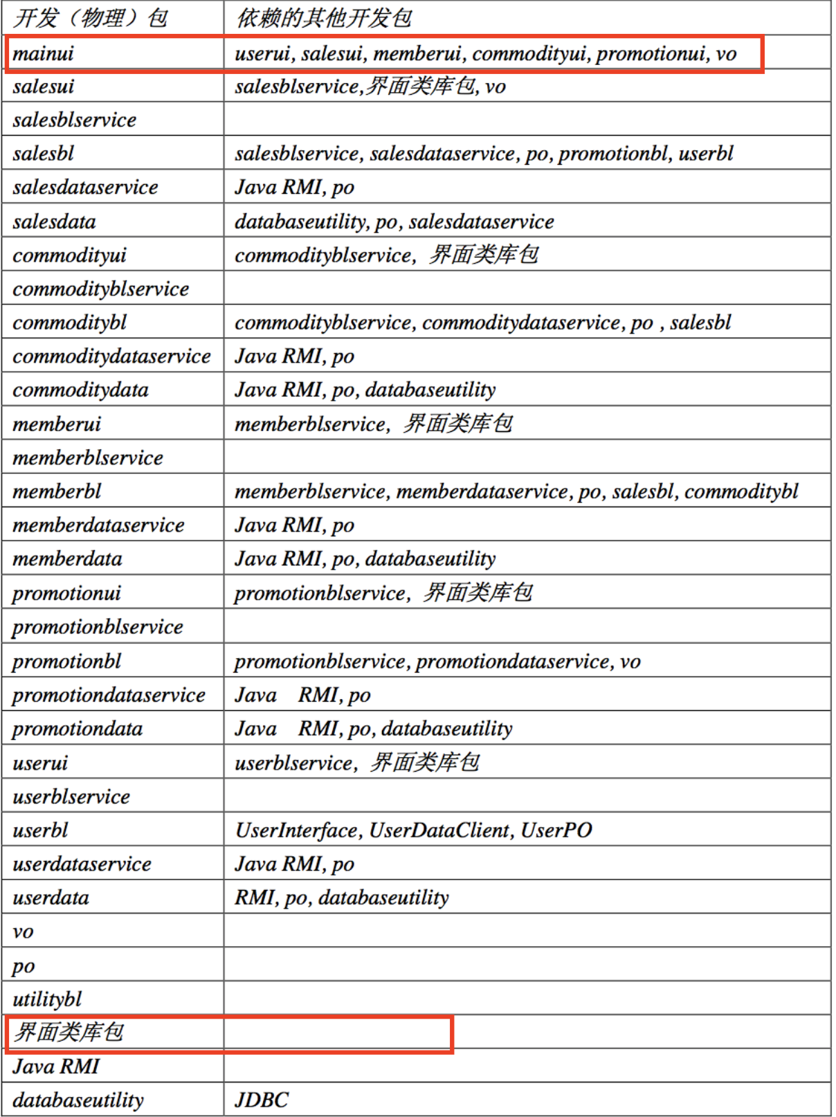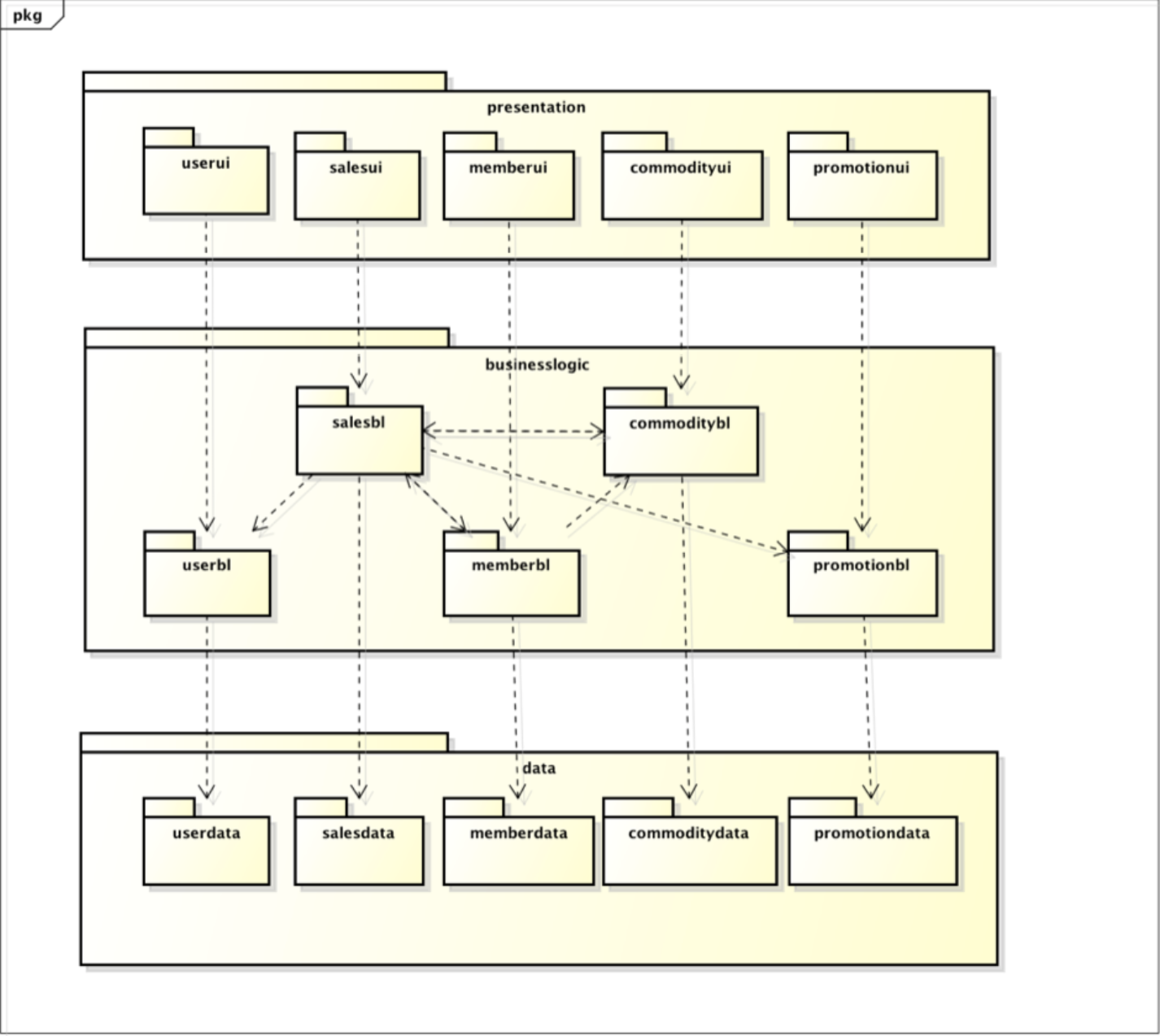此时的SaleUI包还是需要获得好多逻辑层包的数据,他们不直接相连,而是SalesUI对应的逻辑层包负责与逻辑层其他的有数据需求的包相连进行联系,这就实现了开发中的跨足沟通(代价大)转化为组内沟通(代价相对小)