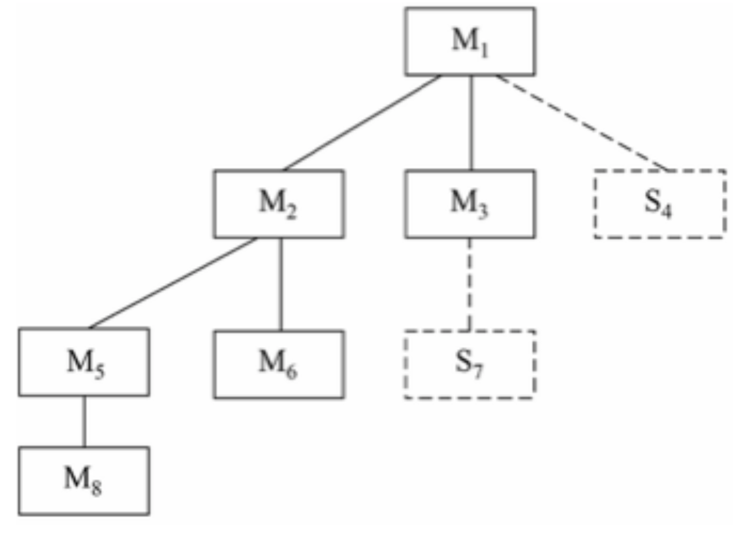 如M1写好之后,与已经写好的M1相邻的模块M2、M3、M4的桩程序(作为这几个模块的代替)来测试,如果测试通过,那么M1就OK - 写好的模块测试时,直接相连的模块用桩程序代替参与测试