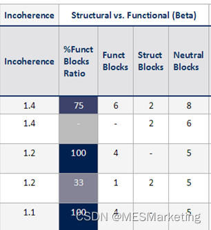参看表 1中以对功能模块和结构模块的统计和指标功能模块占比,指标功能模块占比100%表示纯功能子系统, -表示纯结构子系统;还有可能是不中100% 的分数,但是,在建模实践中,我们强烈建议避免这些混合,这种混合子系统下同一子系统层上具有结构模块和功能计算模块,可能会影响可读性、可理解性,尤其是可测试性。因此,最好尽量让这些数字变大或尽可能小,而不是趋于中间傎。