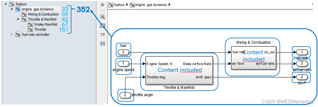 通过计算局部复杂度,我们可以查看模型组件的大小,或者子系统的复杂程度。从子系统重新开始,现在我们扩展到更大范围研究模型系统或子系统的全局复杂度,以了解模型系统的实现规模。因此,对于同样的模型系统或子系统如图 6, 子系统由输入端口, 输出端口和两个子系统模块。但现在我们考虑子系统中的所有内容,子系统内部所有实现,如一些计算或更深层级的子系统中包含的内容,如图 6在模型浏览器中我们所看到的那样。现在对模型子系统中包括的所有内容计算所有子系统的复杂度并加和,得到系统的全局复杂度为352。这个模型复杂度的计算考虑了我们在这里看到的所有内容。因此,我们看到当前结构层的全局复杂度不仅包括局部复杂度33,还包括其下各子系统层次结构贡献的局部复杂度。