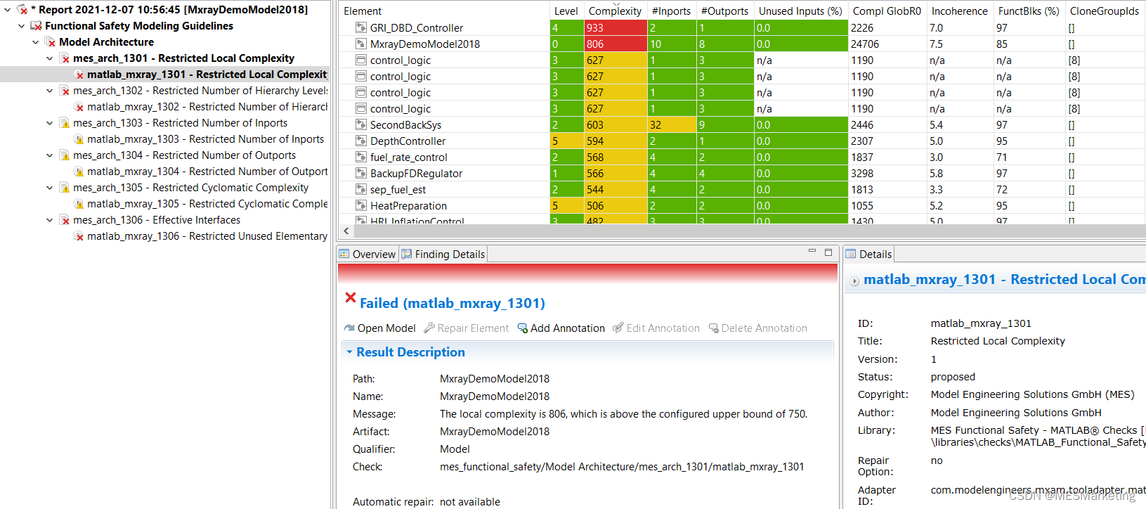 上面我们罗列了模型相关众多的结构性指标,如何获得具体的相应指标精确数值,为模型的设计和重构提供参考。为此,我们可以借助模型检查工具,比如市场上比较受欢迎的模型检查工具MES Model Examiner。MES Model Examiner不仅是一个模型规则检查工具,而且可以精确统计模型结构质量指标,例如全局/局部复杂度,分层深度和接口大小,克隆组,非相干度等指标等等作为检查实现,并将这些结构质量指标显示在专门视图(图 24)中。如图中显示有各子系统的局部复杂度,如显示红色的局部复杂度806,它高于默认设置的局部复杂度为750的上限,于是模型对局部复杂度规则一致性检查的结果给出失败的结果。