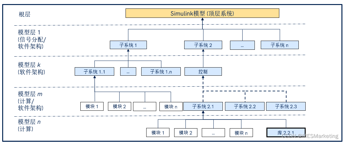 这里我们给出推荐的模型架构设计的最佳实践。在软件开发过程的软件架构部分粗略地定义模型软件架构,同时根据以上我们谈到的相应的模型指标进行模型系统的设计和重构来确保模型系统或子系统符合行业最佳实践和初始的软件架构设计。在详细设计阶段,我们仍然需要注意避免在同一子系统中混合结构和功能模块元素,确保最终得到简易美观分层合理的模型结构。如形成类似图 18所示的适当分层的模型结构,由SimuLink根层作为顶层的系统结构布局,其下层如图中模型层1通过各级子系统实现信号分配和软件架构层,然后其下层模型层K的子系统作为软件架构设计的结构实现。然后,从某层如模型层m开始,作为软件架构的结构层,或者实际功能计算的实现层,直到功能计算的最后一层。即在分层结构中,将结构子系统层保持到最后一层。建模过程中通过合理使用库链接或模型引用简化系统复杂度,最终形成简单易读、易测试、易维护的模型架构。