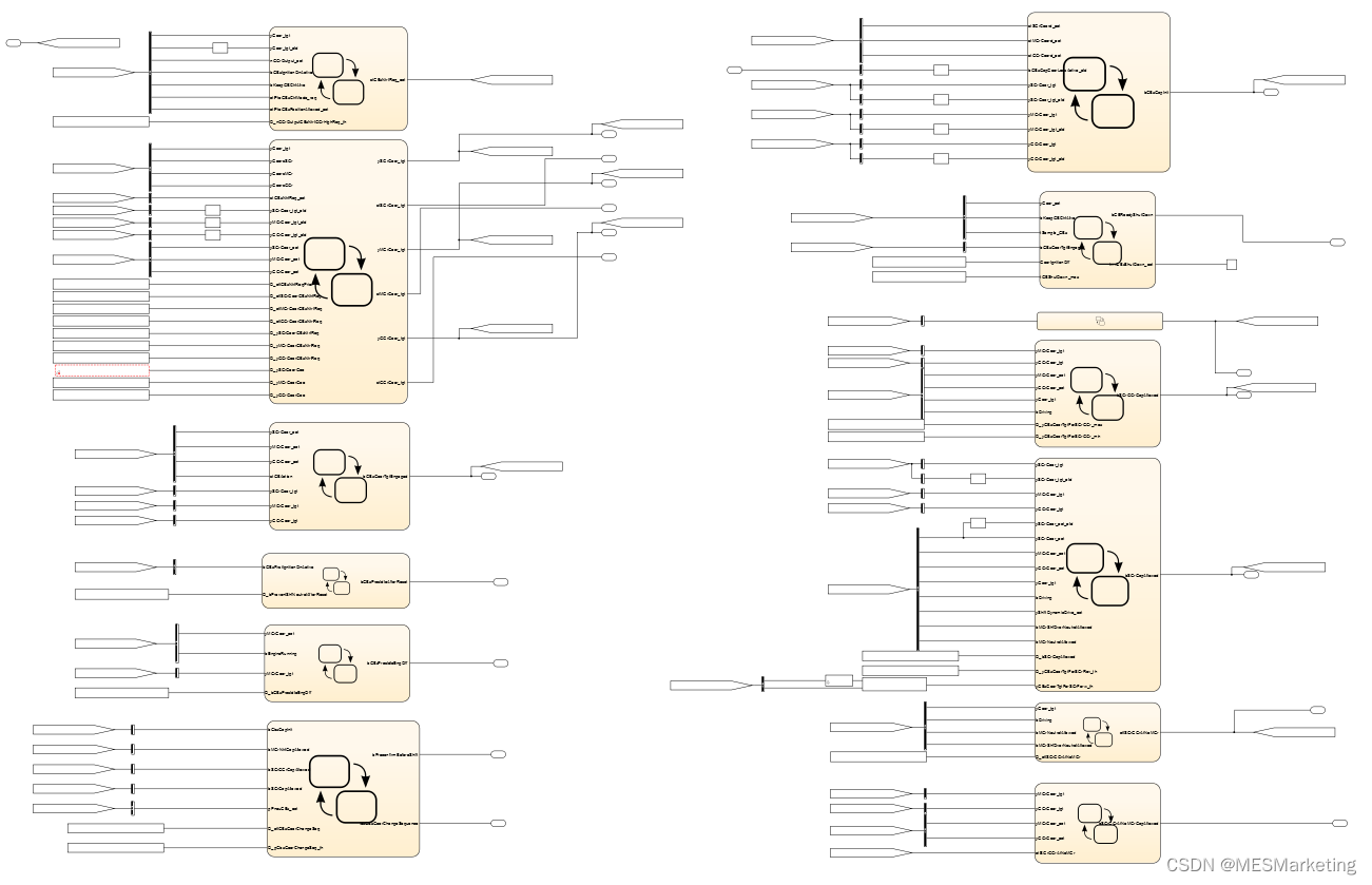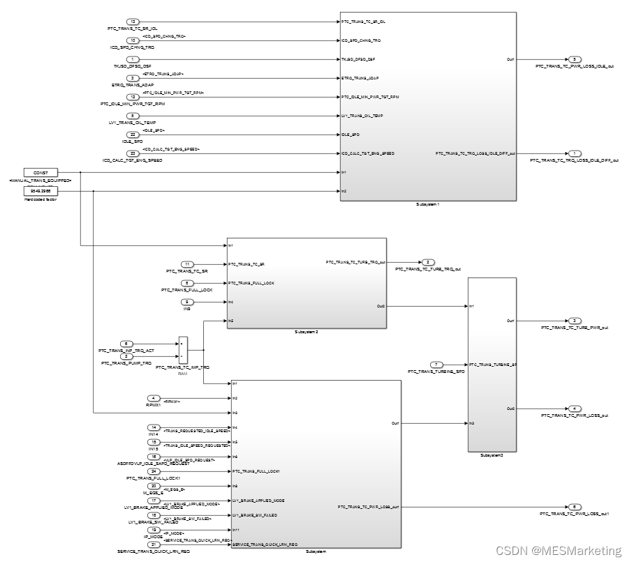 模型指标非相干度值除了帮助我们进行粗略的分离组件的估计,还能帮助我们避免隐式数据流的设计。我们来看看图 14这个例子。子系统由很多单独的图表组成,主要信号数据流被 goto/from模块隐藏,很难理解信号的属性和流向。统计显示子系统具有非常高的局部复杂度,可读性差。但是同时我们又注意到,非相干度数值只有3,意味着goto/from 模块的使用在观感上分隔了功能组件,但实际上它们可以简化为三个主要的功能组。而重构后的模型图 15表明,到结构层的子系统及数据信号流等方面得到更清晰的呈现,同时也显著降低了局部复杂度。