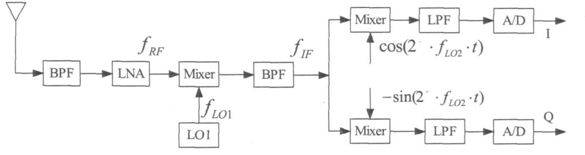 输入信号首先被下变频到一个合适的中频, 随后进行正交的二次下变频, 形成模拟的正交双通道, 两个通道的信号经过低通滤波后再分别采样。该结构通过适当选择中频频率和滤波器可以获得较好的选择性和灵敏度,该结构存在两级下变频过程, 电路较为复杂, 外围元件多, 不适用于体积和功耗受限的应用场合。