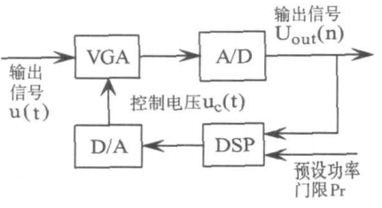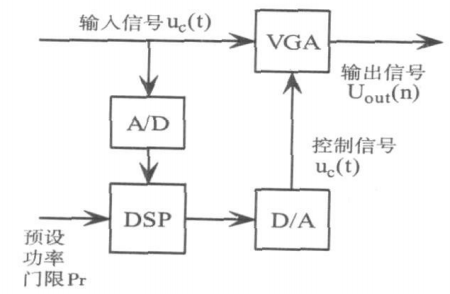 数控AGC通常由可变增益放大器(VGA),ADC,数字信号处理部分,DAC构成。其原理是利用ADC采集信号,通过数字信号处理,得到信号的功率,将该功率和预先设定的功率Pr进行比较,然后根据结果调整DAC输出电压,控制环路增益,