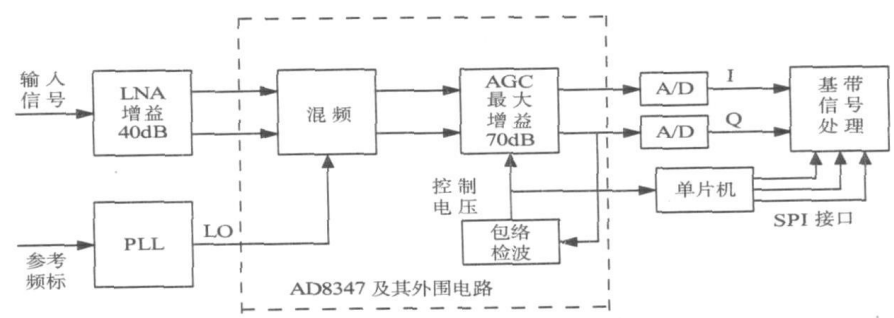 AD8347 将 RF 可 控 增 益 放 大 器(AGC)、正交下变频器、本地振荡驱动器、DC失调调零电路, 以及具有可调节 DC共模电平的双通道差分输出放大器都集成在片内了, 该芯片甚至还集成了一个基带电平检测器。该芯片能够提供 70dB的最大增益, 因此, 只需要单片 AD8347, 外加少量的外围元件, 再配上一个 LNA 以及一个 LO 电路, 即可构成一个完整的接收机系统。整个接收机的体积能够最大限度的得以减小。 AD8347在 5V 电压供电时, 典型工作电流为 64mA, 功耗仅 320mW 。
