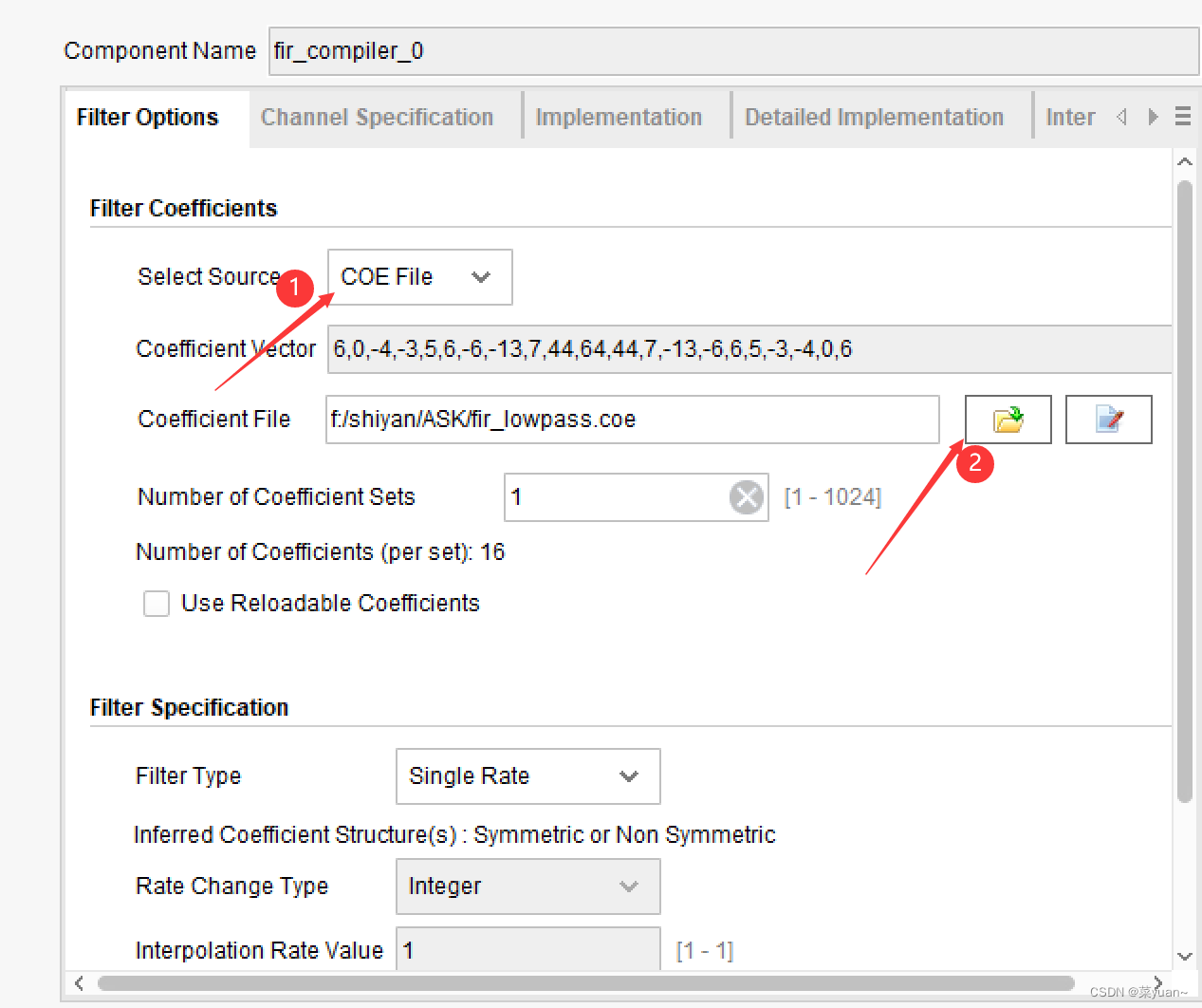 (1) 选择coe文件格式,将FIR 的coe文件加载进去,FIR低通滤波器的设计可以参照