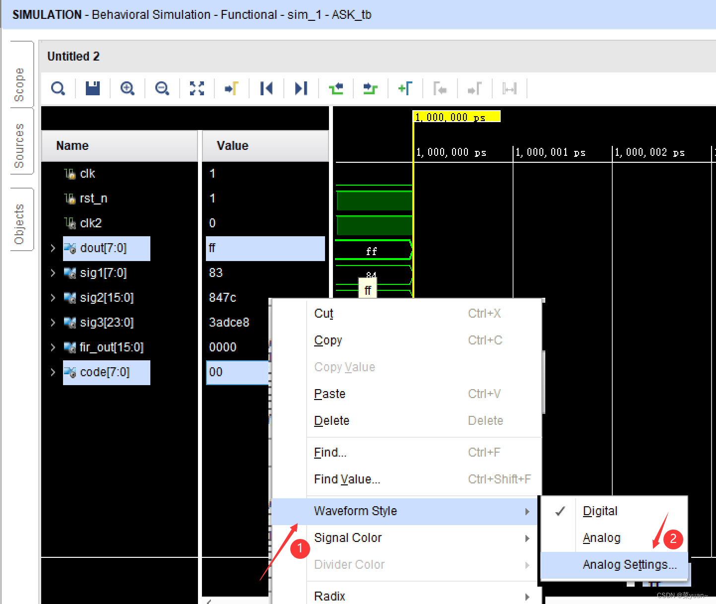(1) dout和code的Waveform Style要选择Analog Settings中的hold,这样才能产生方波信号,并且Radix要选择Unsigned Decimal