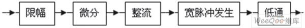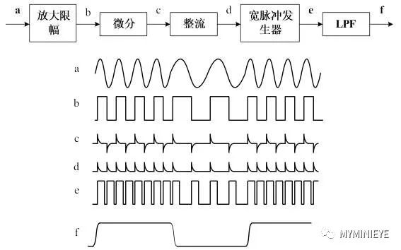 FSK过零检测法。 它利用信号波形在单位时间内与零电平轴交叉的次数来测定信号频率。输入的已调信号经限幅放大后成为矩形脉冲波,再经微分电路得到双向尖脉冲,然后整流得到单向尖脉冲,每个尖脉冲代表信号的一个过零点,尖脉冲重复的频率是信号频率的两倍。将尖脉冲去触发一单稳态电路,产生一定宽度的矩形脉冲序列,该序列的平均分量与脉冲重复频率,即输入频率信号成正比。所以经过低通滤波器的输出平均量的变化反映了输入信号的变化,这样就完成了频率-幅度的变换,把码元“1”与“0”在幅度上区分开来,恢复出数字基带信号。实现2FSK解调器的原理方框图如图所示。