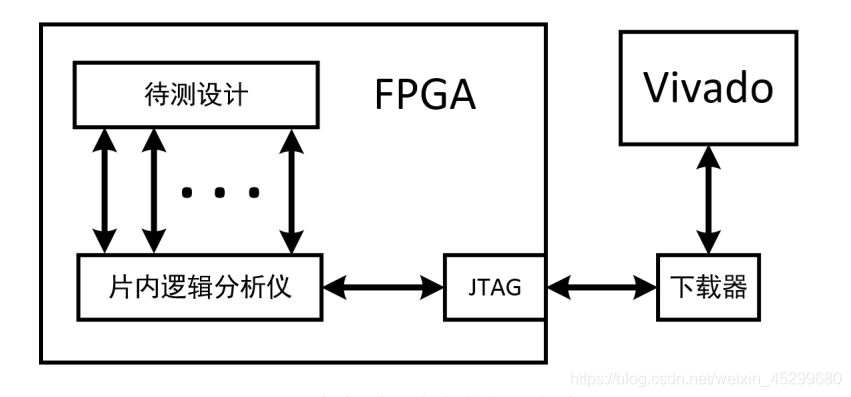 在线逻辑分析仪(ILA)Vivado的在线逻辑分析仪(ILA)其借用了传统逻辑分析仪的理念以及大部分的功能, 并利用 FPGA 中的逻辑资源, 将这些功能植入到 FPGA 的设计当中。如下图所示,ILA占用一部分FPGA内部逻辑资源,可看做一个模块,被设计模块所调用。ILA使用时需要与下载器连接,将FPGA的测试信号传回到vivadoIDE中,显示波形以供调试。运行过程如下: