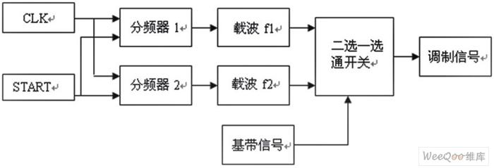 其中: ![]() 2FSK信号的产生方法主要有两种。一种可以采用模拟调频电路来实现,另一种可以采用键控法来实现,即在二进制基带矩形脉冲序列的控制下通过开关电路对两个不同的独立频率源进行选通,使其在每个码元Ts期间输出f1或f2两个载波之一。这种方法产生2FSK信号的差异在于:由调频法产生的2FSK信号在相邻码元之间的相位是连续变化的。而键控法产生的2FSK信号,是由电子开关在两个独立的频率源之间转换形成,故相邻码元之间的相位不一定连续。 针对FSK信号的特点,我们可以提出基于FPGA的FSK调制器的一种实现方法--分频法,这种方法是利用数字信号去控制可变分频器的分频比来改变输出载波频率,产生一种相位连续的FSK信号,而且电路结构简单,容易实现。在2FSK信号中,载波频率随着二元数字基带信号(调制信号)的“1”或“0”而变化,“1”对应于频率为f1的载波,“0”对应于频率为f2的载波。2FSK的已调信号的时域表达式为: