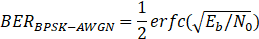 BPSK的误码率在不同的信道下,理论值不同。在高斯白噪声信道下,理论误码率为如下公式: