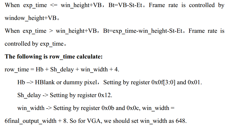 如果曝光时间超过win_height+VB,也就是在曝光没有在正常的一帧时间内完成,那么肯定需要继续曝光,帧时间由曝光时间确定。帧同步无效时间=曝光时间-win_height-启动时间-结束时间。