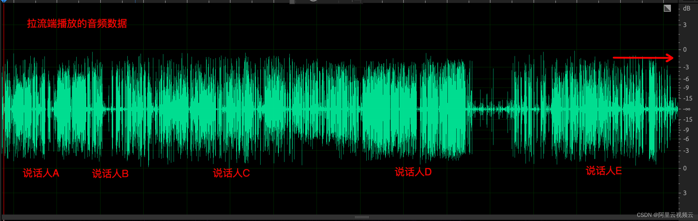 同时,我们录制了一次多人会议中参会人 F 本地播放音频数据,参会人 A ~ E 最终推流音量基本都被均衡到-3dB 附近,对于参会人 F 而言,他主观听感上基本是一致的。