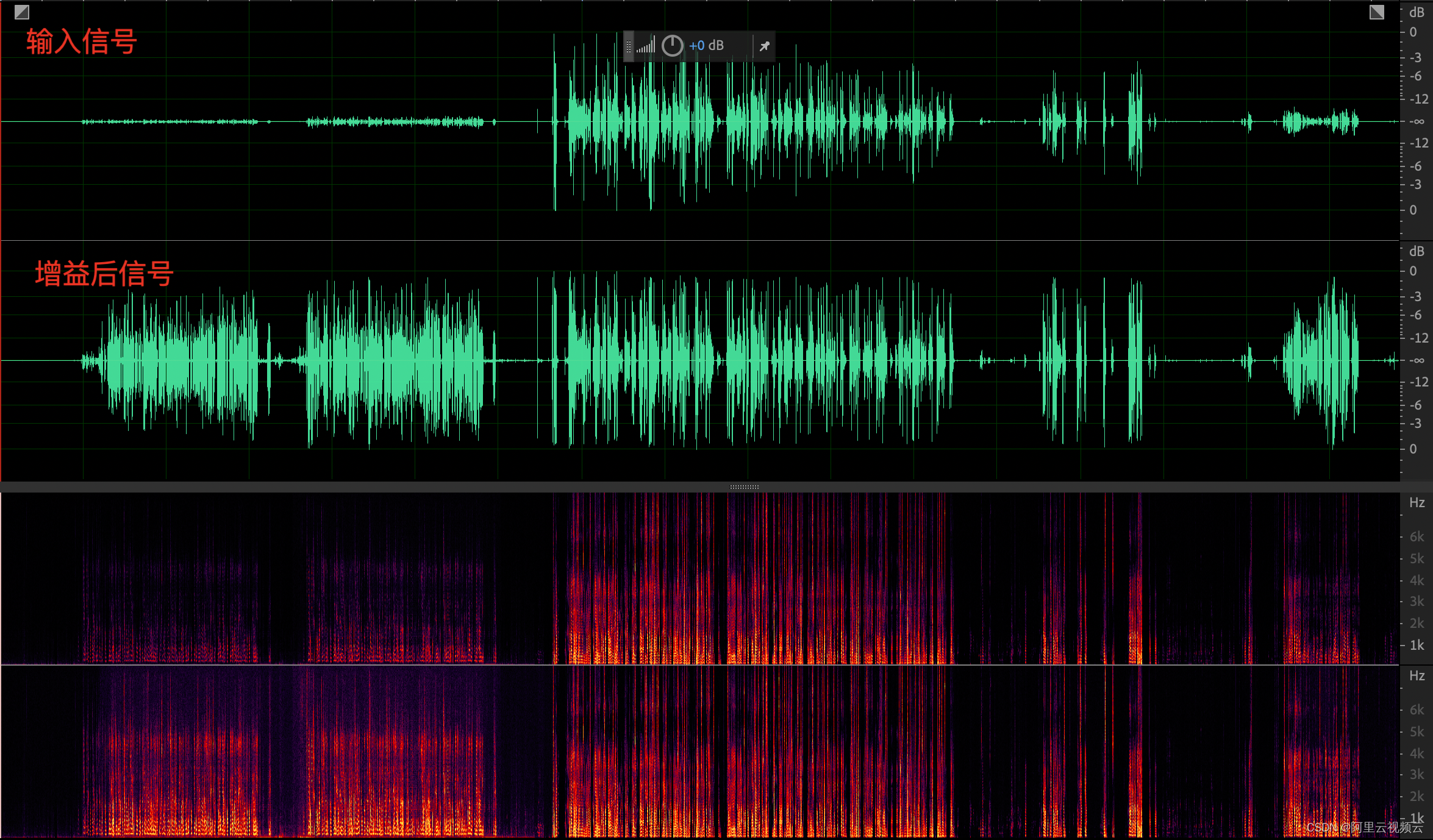 下面来看一个比较极端 case:人声由大到小交替变化,如果增益自适应调节不及时我们会看到波峰被压限器削平的情况,以及小音量提升不及时的问题(可以在深入浅出那篇文章中查看)。优化之后可见,整体输出音量平稳,且波形保持完好。