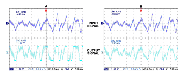 通过监测增益衰减控制电压和信号波形(图3),可以观察到较长和较短响应、释放时间的效果。为了产生有代表性的波形,输入信号采用的是满音量的音频信号。在总体信号强度相对恒定的波形中,较短的响应和释放时间会导致频繁的增益调整。而较长的响应和释放时间则维持平滑的增益响应,避免放大器响应过快,从而在基本保留动态范围的同时维持整个信号的幅度。