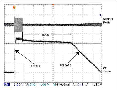 图2表示一个小幅度信号上突发一个大幅度脉冲的效果。随着增益陡降,大信号脉冲的幅度在输出波形上被明显衰减。图中控制增益降低的电压是CT引脚外接电容的电压,由电容设置响应时间。控制电压在指定时间内和增益衰减(dB)成比例。