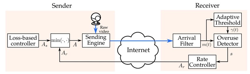 GCC核心思想就是通过预测可用带宽来控制发送的速率,并结合发送端和接收端两端各自估测的带宽来综合计算,其中发送端的带宽估测主要依赖于丢包率(其实也有延迟),接收端的带宽估测依赖于延迟(的变化)。打个比方,GCC的角色就像是一个繁忙的十字路口的交警,当前方道路车辆太多时,他会阻止后方车辆继续行驶,防止交通堵塞,当前方道路车辆较少时,他会加速放行,让后方车辆尽快通过。当然,GCC实际控制流程远比交警来的复杂。换句话说,GCC主要是依靠丢包、延迟、抖动等网络参数来预估当前的可用带宽进而控制发送的速率从而避免网络拥塞引起的丢包、延迟、抖动等现象,是一个反馈的过程。