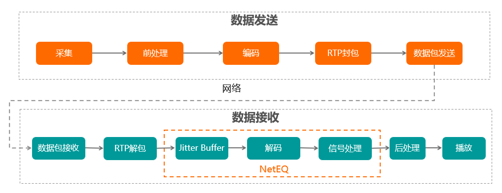 RTC音频通讯部分正常的工作流程如下:首先在发送端采集音频数据,并对采集到的声音信号进行回声消除,噪声抑制以及自动增益控制等前处理,然后进行语音压缩编码,封装成RTP包并通过网络发送到接收端,接收端接收到数据后,进行RTP解包,然后进行抖动消除,丢包隐藏,解码等操作,最后将处理过后的音频数据送给播放器播放。其中NetEQ涉及的操作包含抖动消除,解码以及相应的音频信号处理,简单来讲,NetEQ本质上就是一个音频的抖动缓冲器(JitterBuffer),它工作在音频数据接收端,通过抖动消除,丢包隐藏等操作达到音频流畅播放的目的。