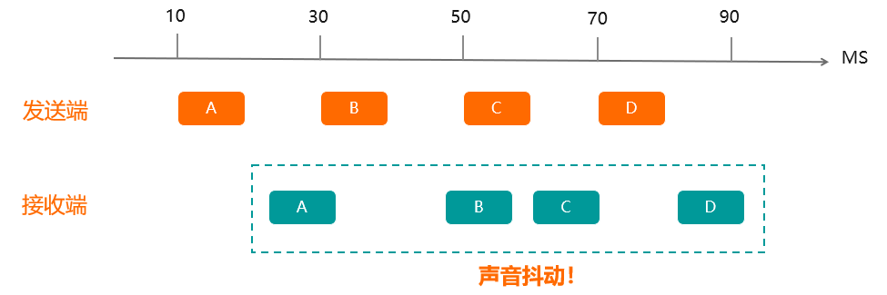抖动现象是怎么产生的呢?如上图,在没有技术干预的情况下,发送端按照20ms的时间间隔发送音频数据包,由于网络延迟等影响,数据包到达的时间并不是均匀的,这时候如果直接送到播放器播放,我们听声的声音是存在抖动现象的,为了避免这种情况,我们通常做法是通过抖动缓冲技术来消除,即在接收方建立一个缓冲区,语音包达到接收端时,首先进入缓冲区暂存,随后系统再以平滑的速率将语音包从缓冲区取出,经过解码后播放出来。当然,只是简单的设一个缓冲区是远远不够的,因为缓冲区设的太小,有可能起不到缓冲效果,设的太大,有可能导致音频延迟,那缓冲区到底要设多大呢?这个就要看具体情况了。抖动消除思想的理想状态是每个数据包在网络传输中的延迟与其在抖动缓冲区中缓冲的延迟之和应该相等,因此一般的抖动消除思想是将抖动缓冲区大小设为目前测到的最大网络延迟大小,而且每个包在网络中的延迟加上其在抖动缓冲区中缓冲产生的延迟之和应该等于抖动缓冲区大小。