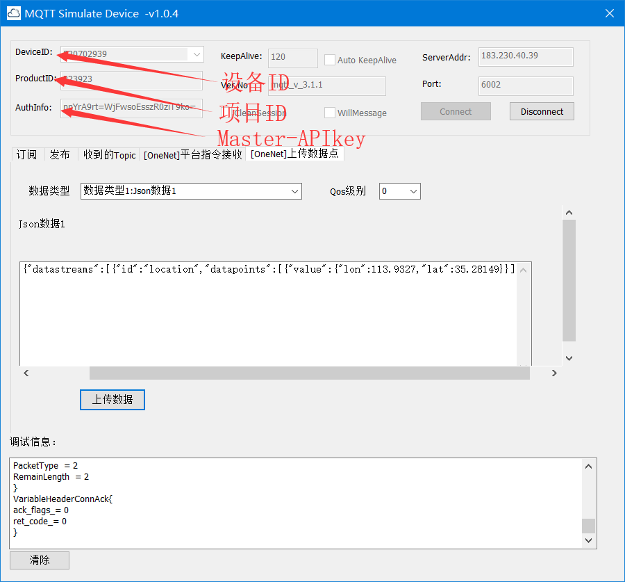 - 使用MQTT Simulate Device 进行模拟配置(在没有实体设备或者不太懂onenet到底怎么传输数据的时候可以先用这个工具进行模拟,工具下载连接在oennet官方论坛有或者使用这个:https://upfiles.heclouds.com/123/ueditor/2016/09/26/99dd0b18908b05a2f74588d5c9217957.rar可能会失效)