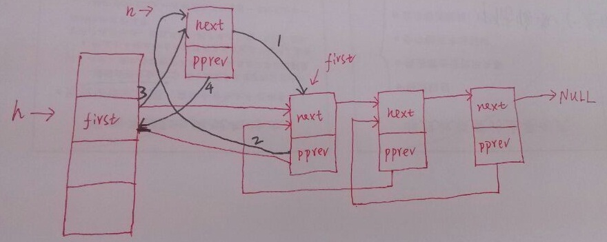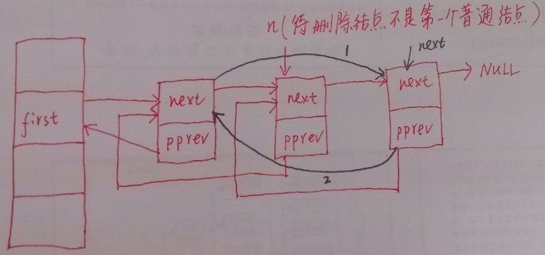 next->pprev = pprev;//设置下一个结点的pprev域,如上图中的黑线2,保持hlist的结构