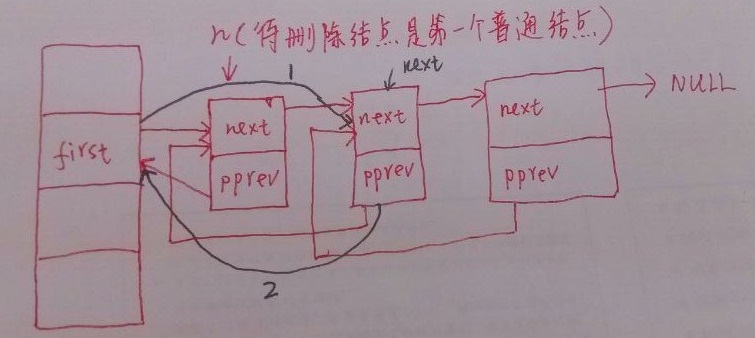 next->pprev = pprev;//将第二个结点的pprev域设置为头结点first域的地址,如上图中的黑线2