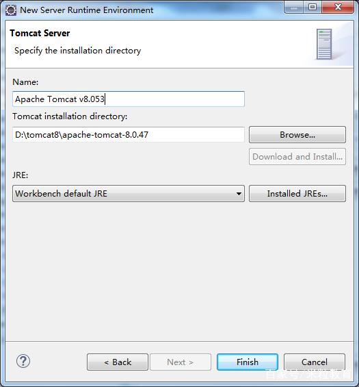 (4)在配置tomcat server对话框中,Name输入域输入Server名称,这里输入“Apache Tomcat v8.053”,也可以是其它名字;Tomcat installation directory输入域选择tomcat的安装路径,这里选择“D:tomcat8apache-tomcat-8.0.47”。填写完毕,单击【Finish】按钮,回到Preferences设置对话框,新创建的Tomcat服务在对话框的右侧列出。如下图所示。