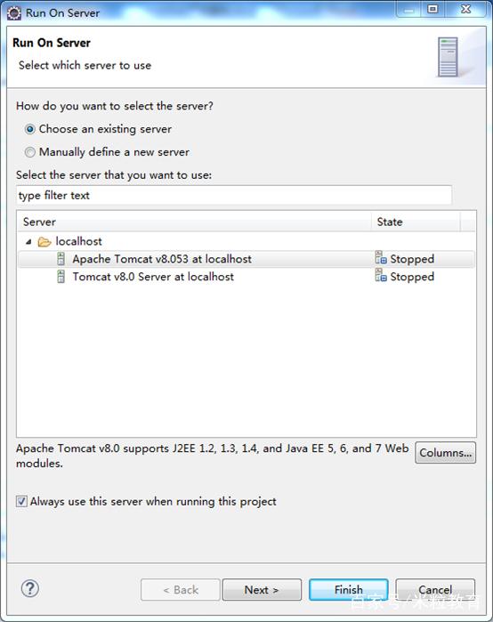 本选项列出所有的Server运行环境,选择前面创建的Apache Tomcat V8.053运行环境。