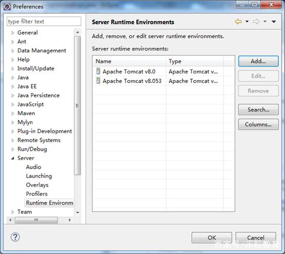 该选项配置Server 运行环境,选择先前创建的Apache Tomcat V8.053运行环境。