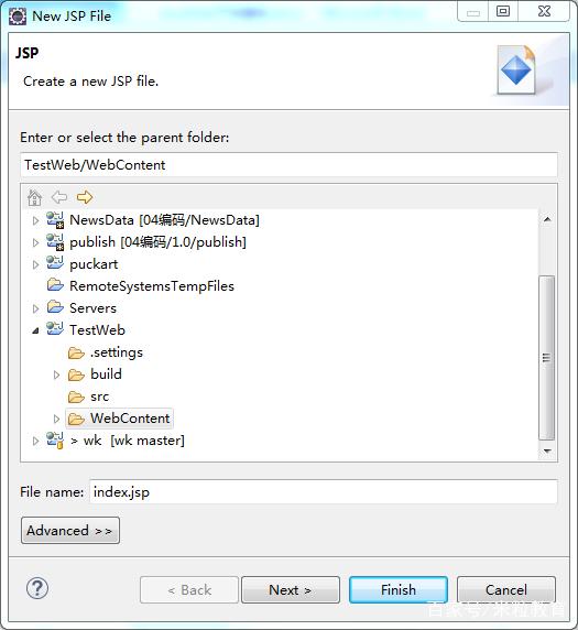 (1)用鼠标选中项目的WebContent目录,单击鼠标右键,在弹出的菜单中选择【New】【JSP File】命令。在出现的New JSP File对话框File name输入域输入“indes.jsp”文件名称,单击【Finish】按钮。